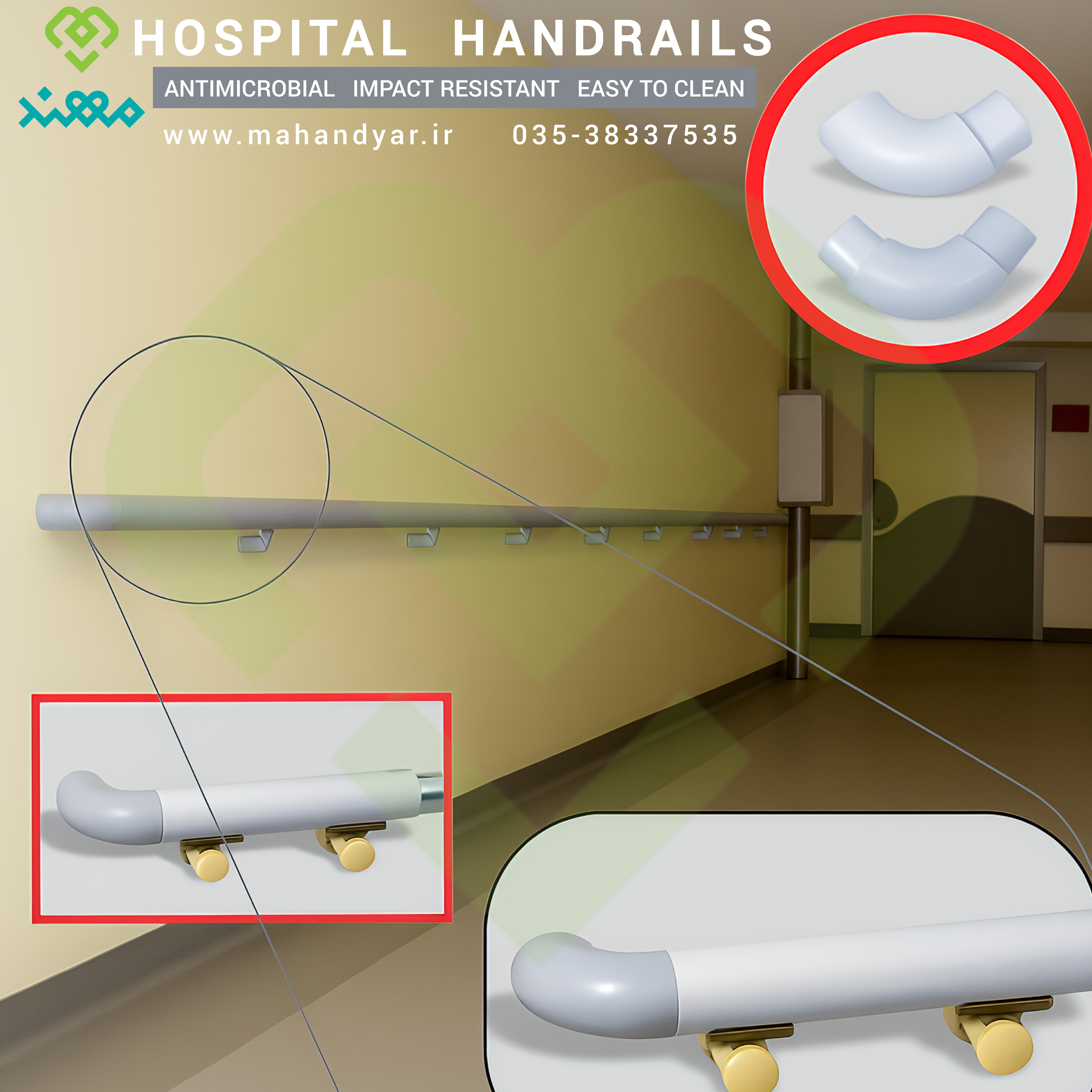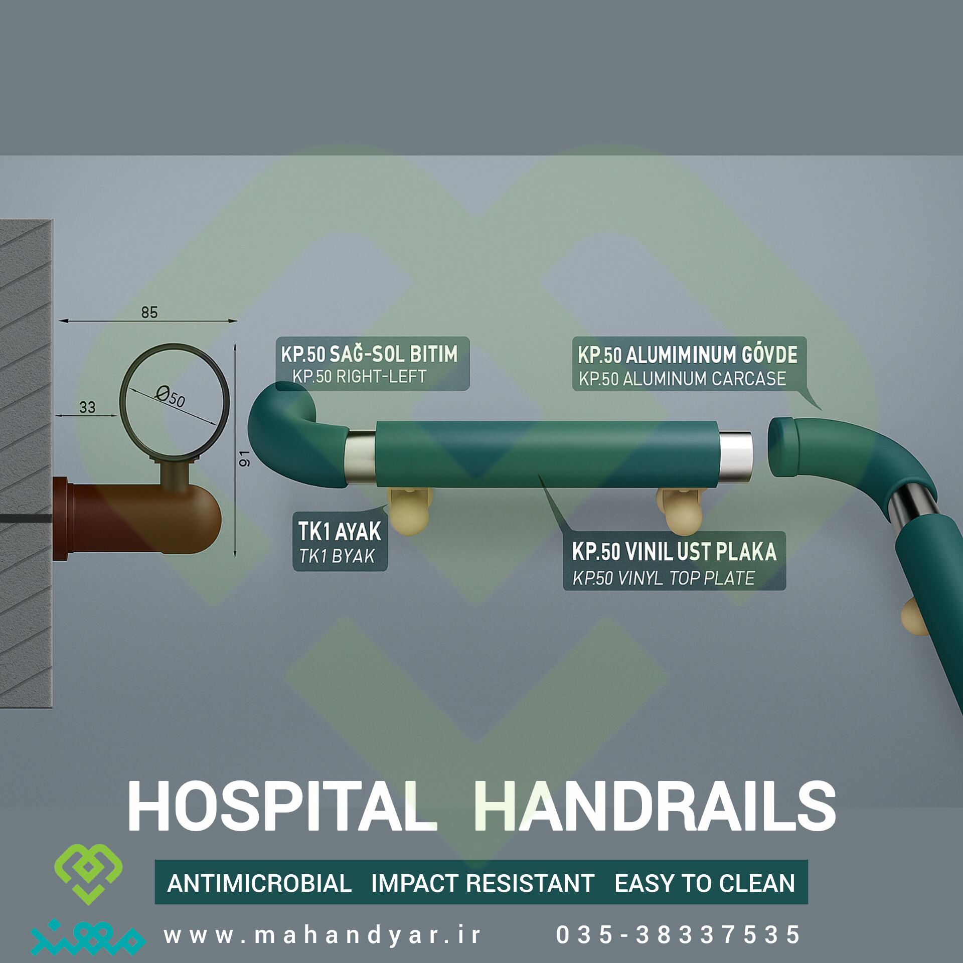 هندریل مدل KP 50 از پروفیل داخلی آلومینیومی مقاوم ساخته شده که استحکام بالایی در برابر فشار، ضربه و استفاده مداوم دارد. پوشش بیرونی از جنس وینیل آکریلیک با دوام بالا بوده و دارای ویژگیهای ضد خش، آنتیباکتریال و ضد حریق است که آن را برای محیطهای بیمارستانی کاملاً مناسب میسازد.