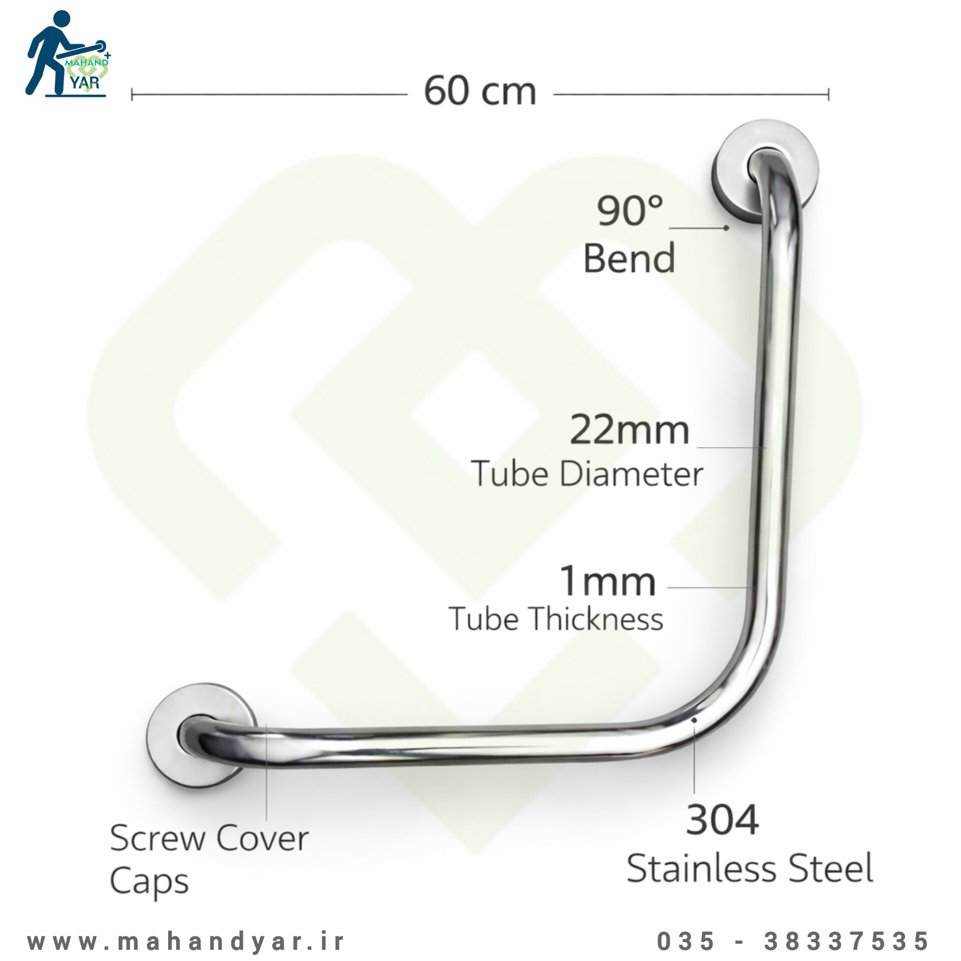 جنس بدنه از استیل ضدزنگ 304 نگیر انتخاب شده که مقاومت بسیار بالایی در برابر خوردگی، رطوبت و مواد شوینده دارد و استفاده طولانیمدت در محیطهای بیمارستانی را تضمین میکند. قطر لوله 22 میلیمتر و ضخامت 1 میلیمتر، استحکام مکانیکی مناسب در کنار ارگونومی مطلوب برای دست را فراهم کرده و حس اطمینان در هنگام استفاده ایجاد مینماید. طول 60 سانتیمتری دستگیره، پوشش مناسبی برای نقاط حساس تکیهگاه ایجاد میکند.