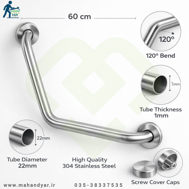 طول کلی دستگیره ۶۰ سانتیمتر با ابعاد نصب ۳۰×۳۰ سانتیمتر طراحی شده و زاویه ۱۲۰ درجه آن، شرایطی مناسب برای نصب در گوشهها و فضاهای محدود ایجاد میکند. وجود درپوشهای محافظ پیچ، ضمن افزایش ایمنی کاربر، نمایی یکپارچه و حرفهای به محصول میبخشد و از تماس مستقیم با اتصالات جلوگیری مینماید.