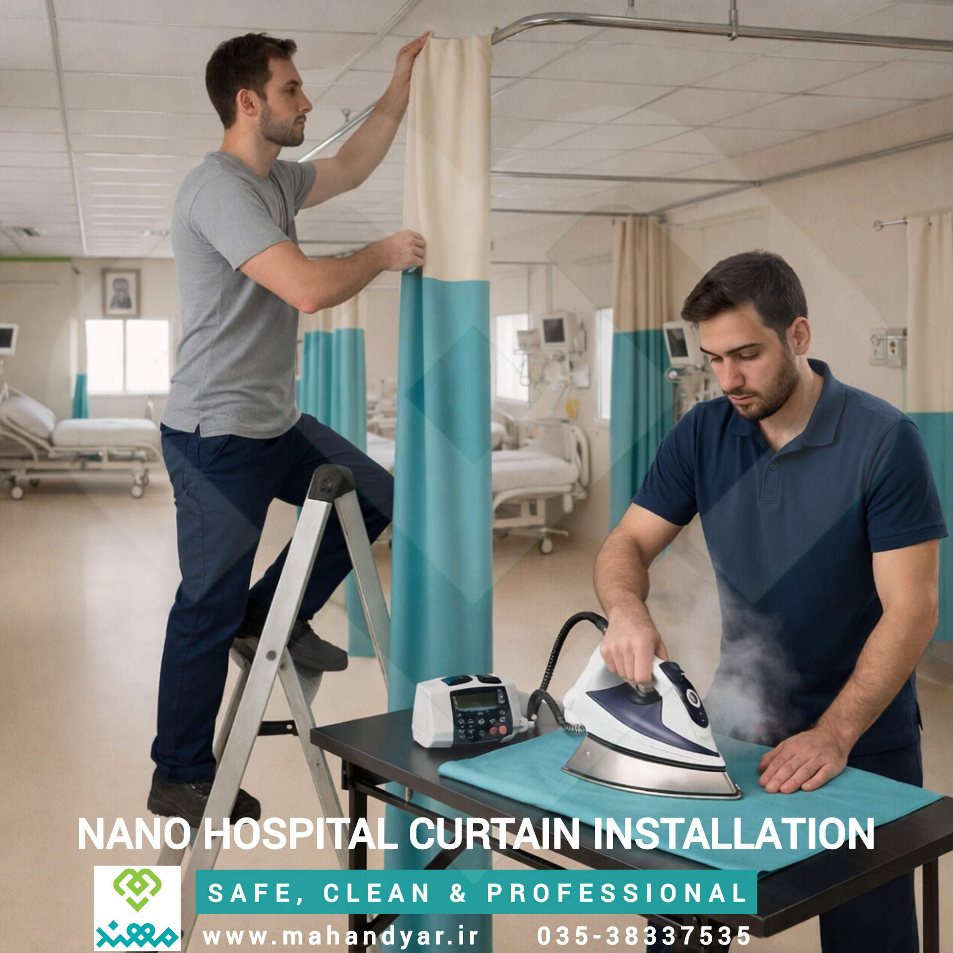شرکت فنی مهندسی مهند با بهرهگیری از تکنیکهای نوین و تیم تخصصی نصب، پردههای نانو بیمارستانی خود را بهصورت کاملاً استاندارد و حرفهای در مراکز درمانی نصب میکند. فرآیند نصب شامل اندازهگیری دقیق فضای بیمارستان، آمادهسازی ریلها و گیرههای مقاوم و ضد زنگ، و آویختن پردهها بهصورت صاف و همتراز است تا عملکرد ضد آب، ضد لک و آنتیباکتریال پردهها بهطور کامل حفظ شود.