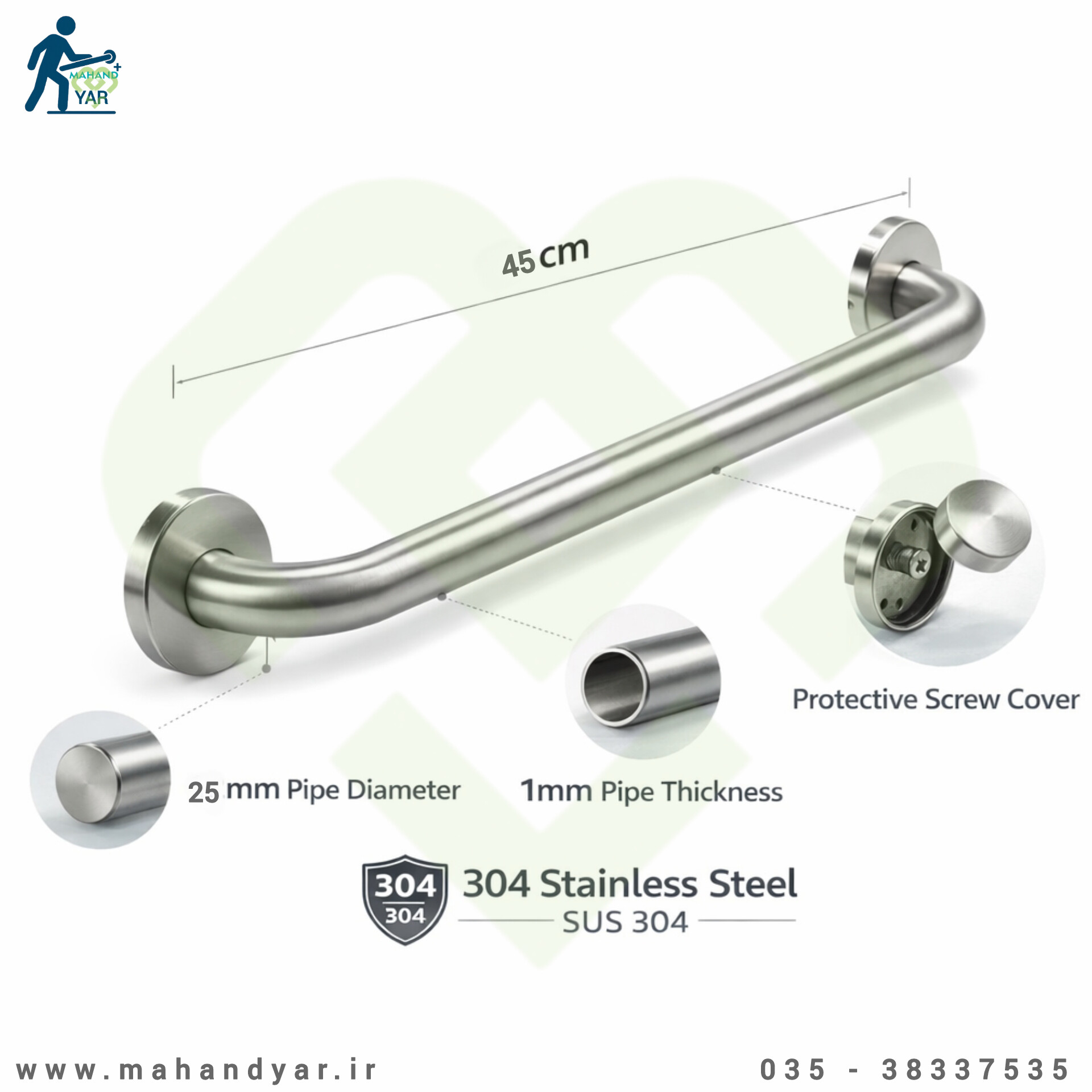 دستگیره استیل کمک سالمندی 45 سانتیمتری تولید شرکت فنی مهندسی مهند، با استیل 304 نگیر، قطر استاندارد 25 میلیمتر، درپوش استیل محافظ پیچ و پوشش رنگ طلایی الکترواستاتیک، محصولی حرفهای، مقاوم و لوکس در حوزه تجهیزات ایمنی و توانبخشی محسوب میشود.